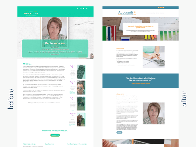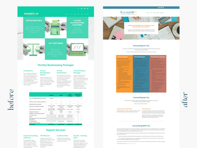 The Accounit-4U website now looks professional and clean-cut but we've kept the friendly and approachable feel that resonates with Jane and her clients. We broke down the content into smaller chunks so it's easy to read and not overwhelming to look at. So now as soon as you jump on the website you're able to know exactly what Accountit-4U does and how they can help you.